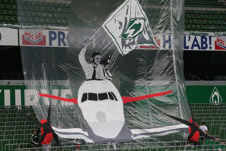Zwischenzeitlich gab es bereits die ersten Gespräche zu der Sache mit der Fanbetreuung von Werder. Zu diesem Zeitpunkt sah unsere Choreoidee noch ein wenig anders aus, als sie letztendlich umgesetzt wurde. Ursprünglich sollte der Flieger mit Thomas im wahrsten Sinne des Wortes einrollen. Dafür hätten wir aber ein Stahlseil benötigt, welches komplett von der Nord- bis zur Südgeraden entlang der Ostkurve gespannt werden müsste, wie es beim Hintertornetz der Fall ist. Es gab bereits vor dem Neubau der Kurve Wünsche diesbezüglich, welche von der Weserstadioninitiative geäußert wurden. Auch vor einem Jahr, im Zuge der Planung der Europapokalsiegerchoreo der Wanderers, gab es Gespräche über eine solche Konstruktion. Damals wurde aufgrund der angespannten finanziellen Lage des Vereins eine kleine Lösung in Form von fünf Rollen unter der Anzeigetafel geschaffen. Durch die weitere sportliche Talfahrt befand sich nun leider wiederum zu wenig Geld in den Kassen, um die gesamte Seilkonstruktion in der abgelaufenen Sommerpause installieren zu lassen. So bleibt uns nun weiterhin nur unsere Hartnäckigkeit, uns weiter dafür einsetzen, dieses Stahlseil in naher Zukunft an unserer Kurve angebracht zu bekommen, um die Choreos im Weserstadion noch vielseitiger und umfangreicher gestalten zu können.